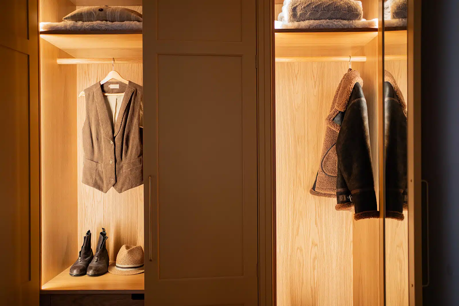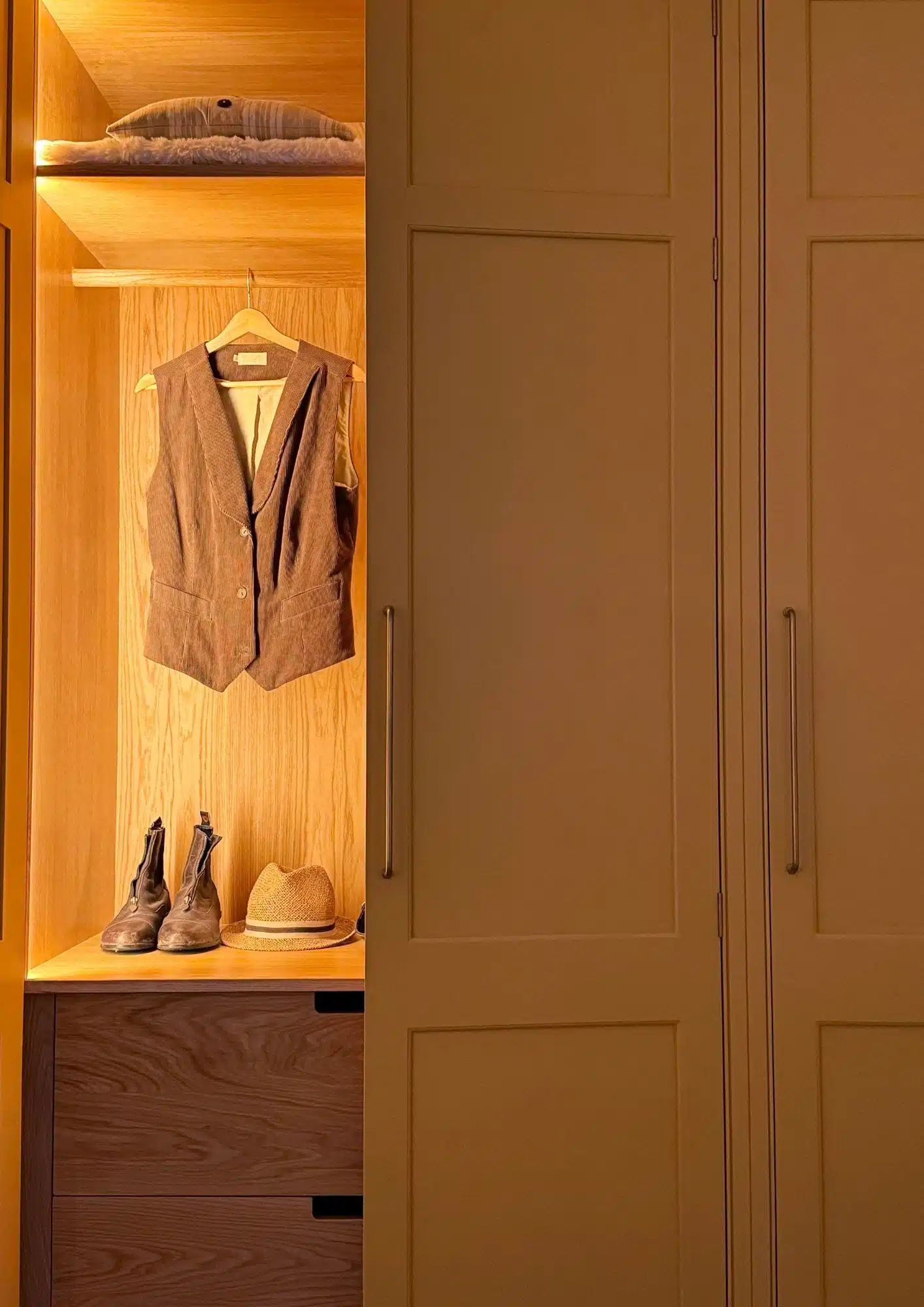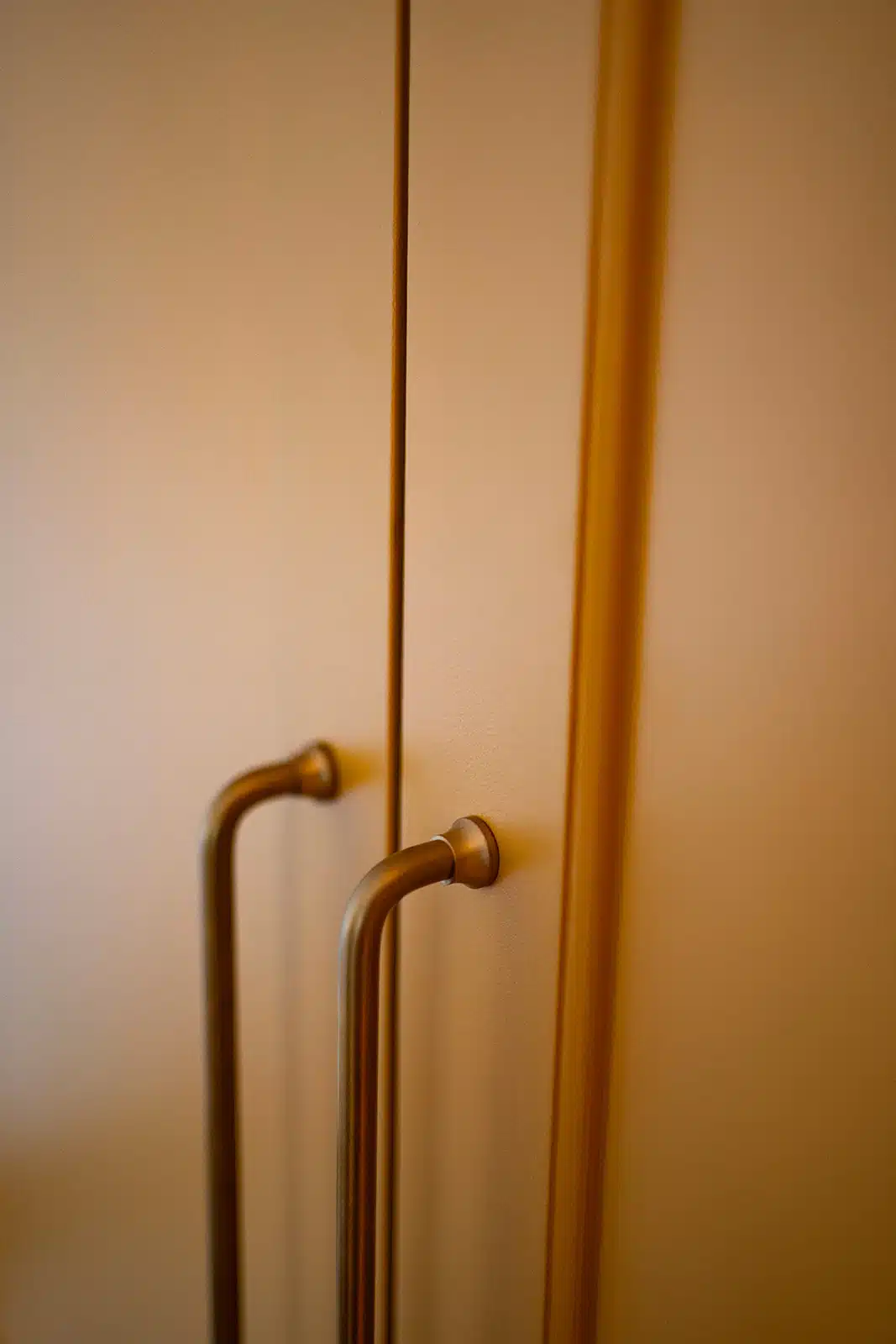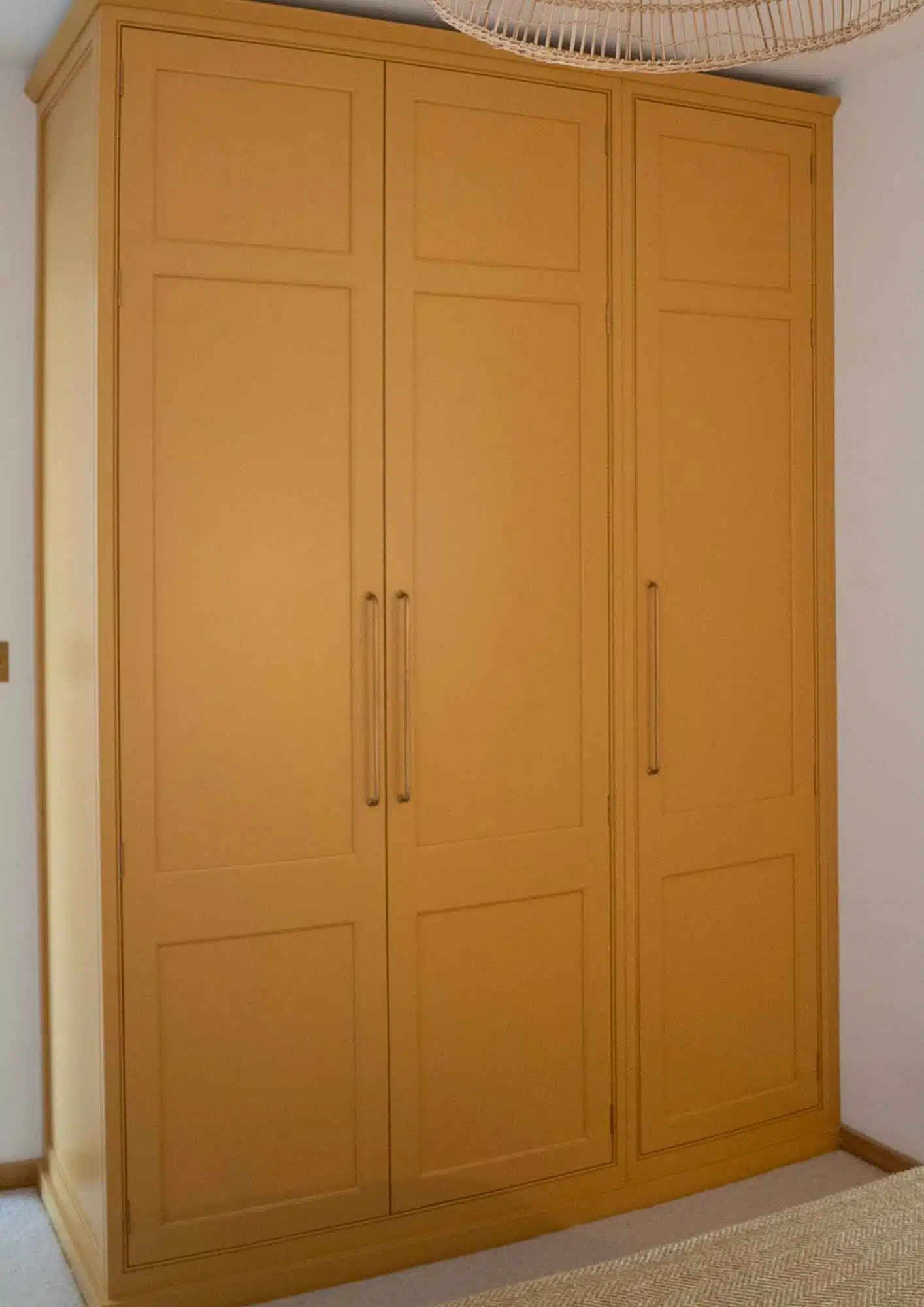 These wardrobes were designed for the second bedroom, we created handmade wardrobes painted in a warm, generous yellow, adding a vibrant yet refined touch. These double wardrobes combine ample shelving and drawers, designed to be both practical and calming, creating a sense of order and elegance within the space.