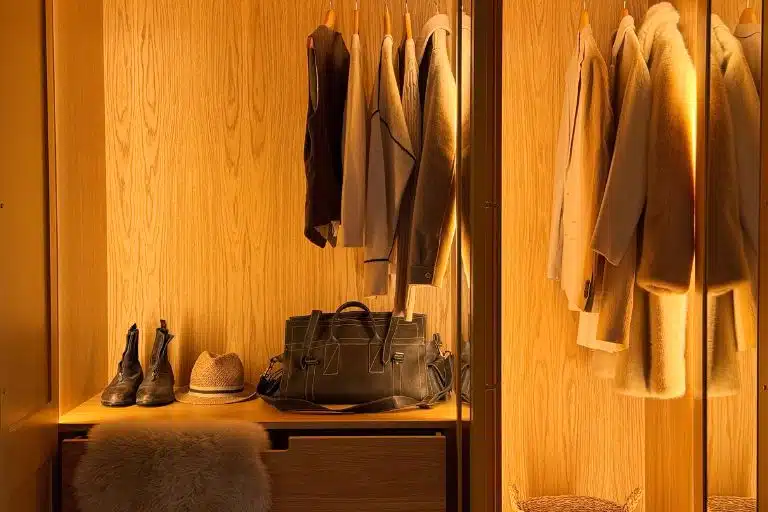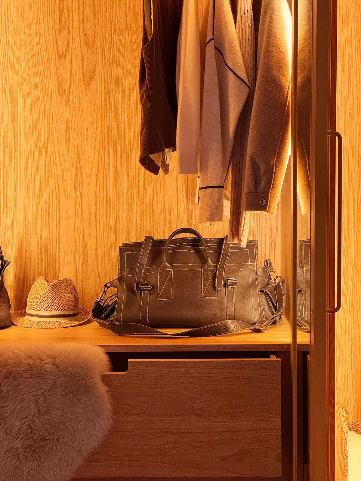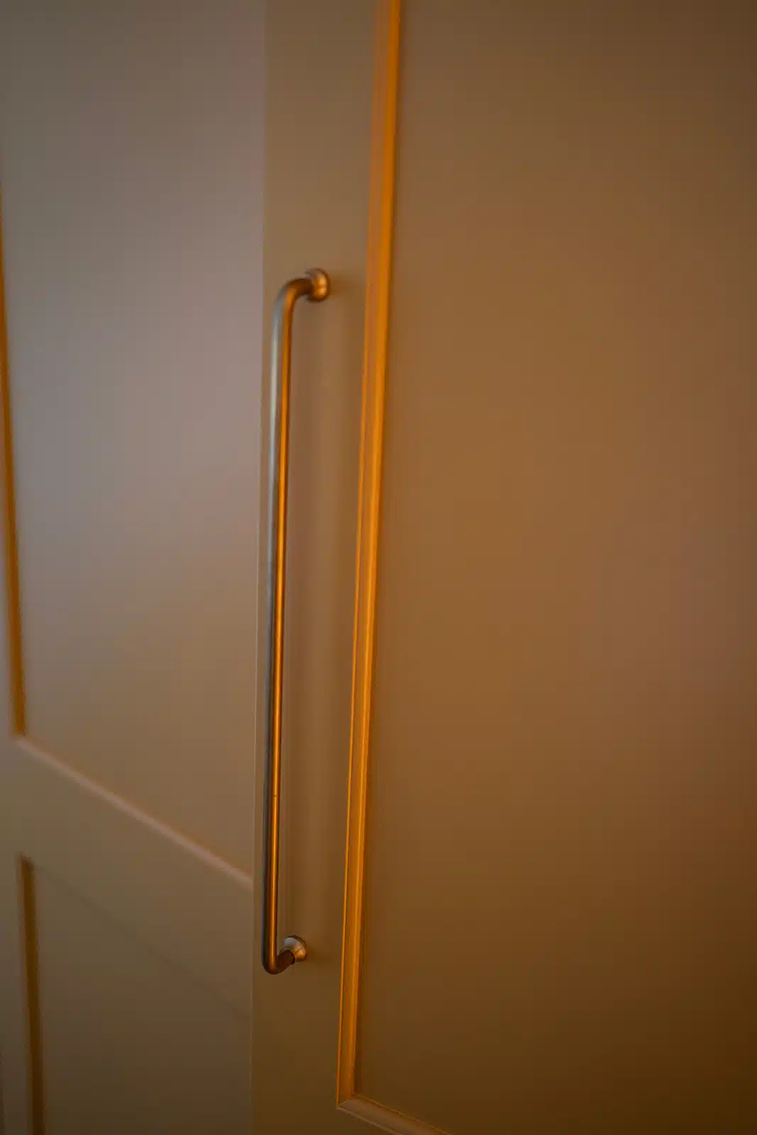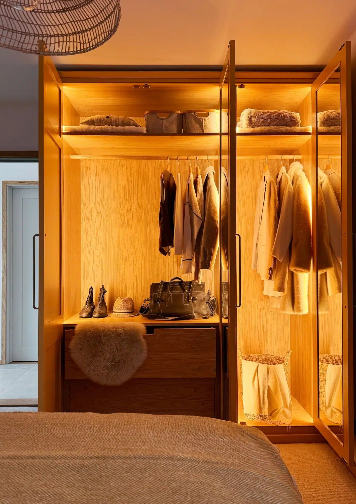 These wardrobes were designed for the second bedroom, we created handmade wardrobes painted in a warm, generous yellow, adding a vibrant yet refined touch. These double wardrobes combine ample shelving and drawers, designed to be both practical and calming, creating a sense of order and elegance within the space.