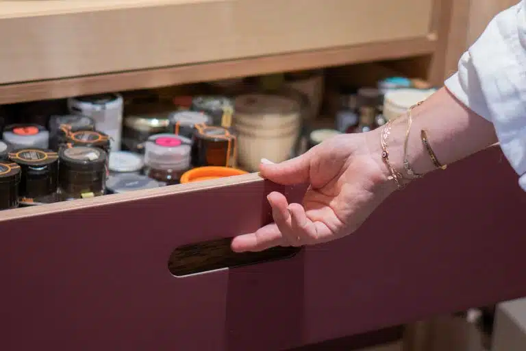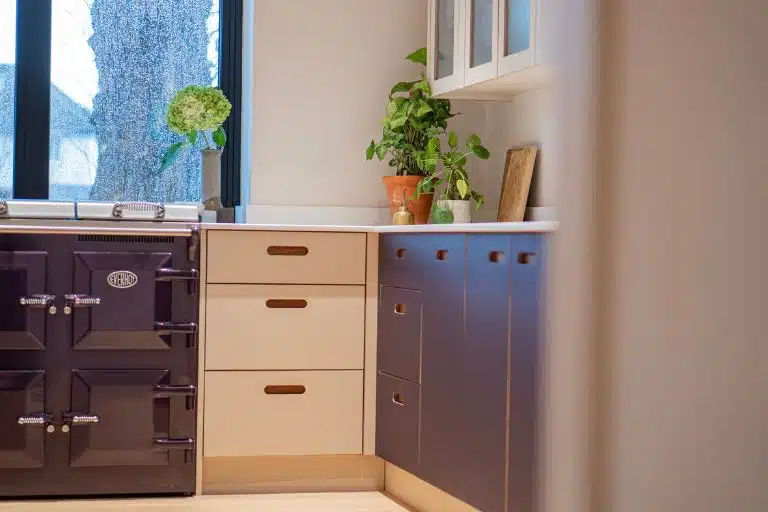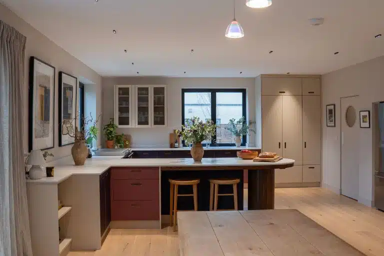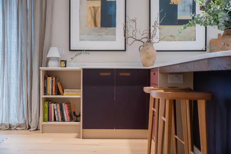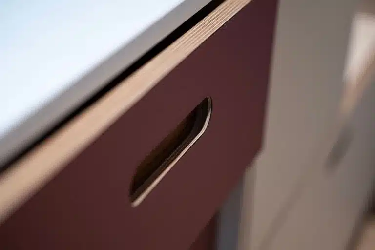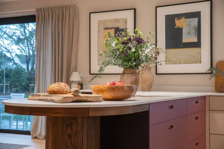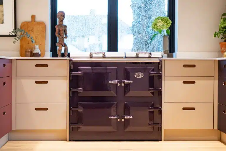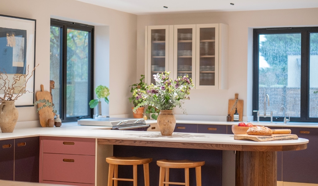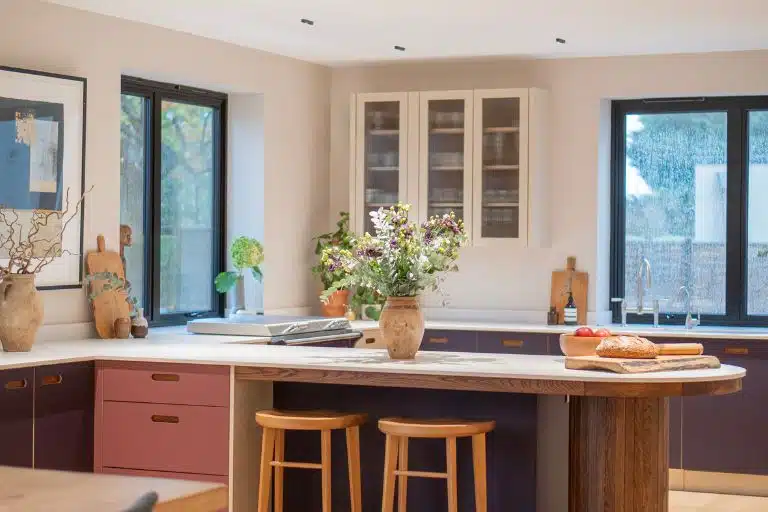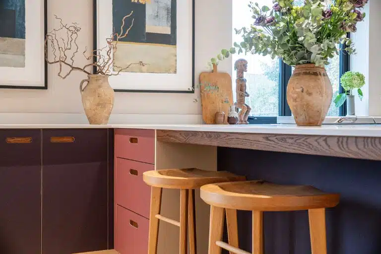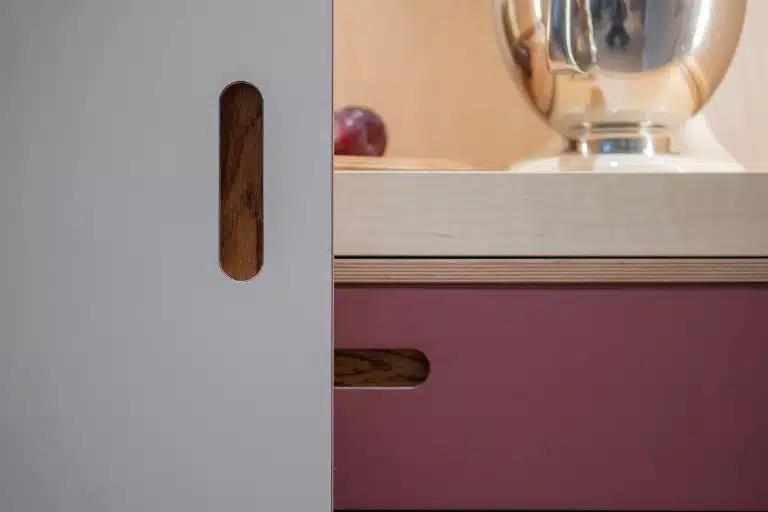 The palette of the kitchen is rich and considered featuring deep aubergine and burgundy tones paired with natural beige Formica laminates, all hand-pressed in our workshop by our master craftsman.  Every detail counts, particularly the cabinetry handles, which our craftsman are very proud of.  These are clever, unique designs, beveled out with an oak insert invisible from inside the drawer.  Its a subtle but striking detail that took many hours and significant care and precision to achieve.