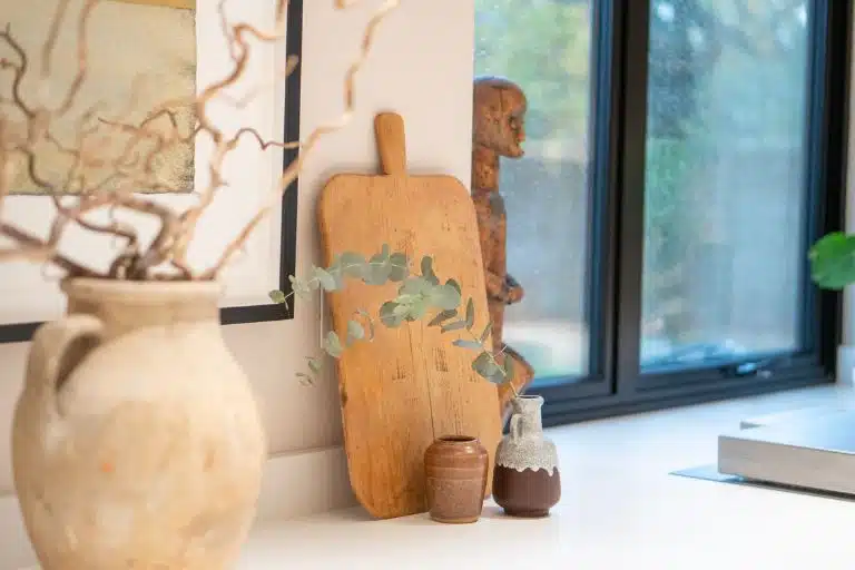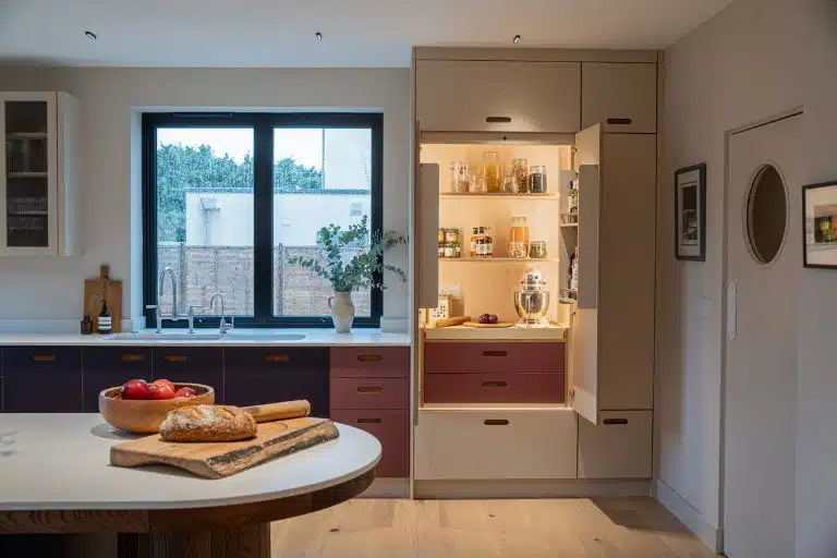 The kitchen also features a textured light worktop, a large aubergine Everhot and a generous plywood pantry cupboard.  Their extension benefits from lots of natural light which floods the space.  A traditional Belfast sink by Shaws of Darwen and classic chrome taps by Perrin & Rowe overlook the garden.  Every element works in harmony, a kitchen that is both functional and beautiful.  The kitchen was designed carefully to be seamlessly part of their creative balanced environment in keeping with the luxury interiors of her home.